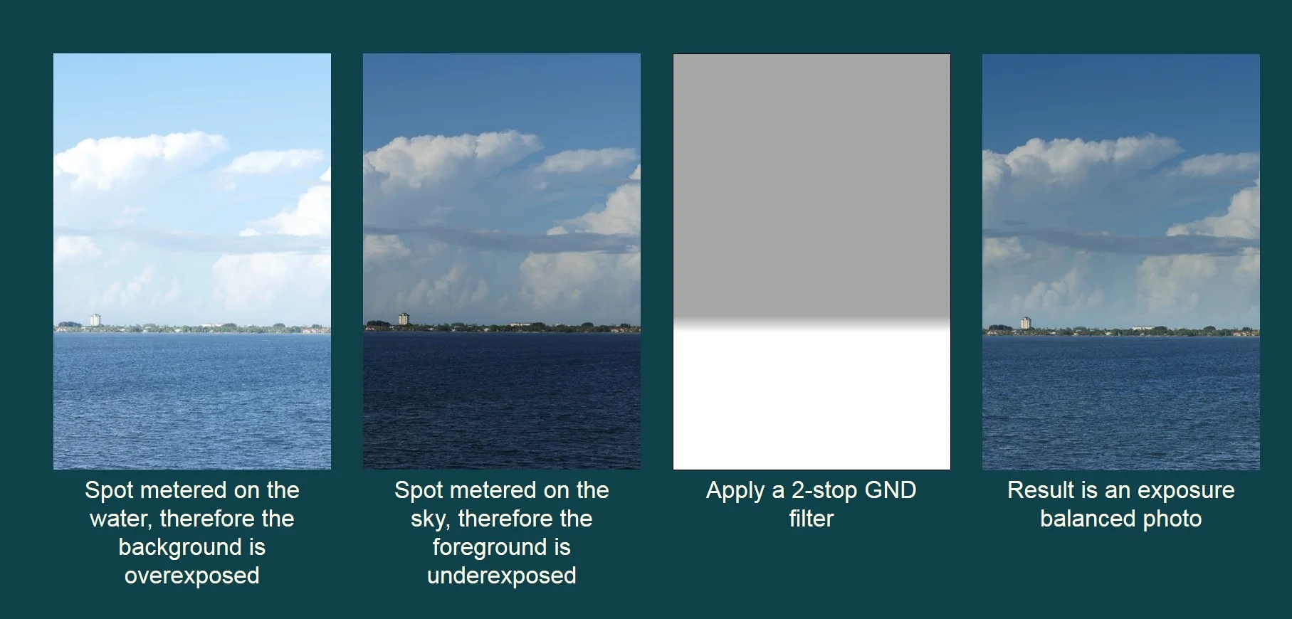 A very common application is the dark foreground and bright sky conditions mentioned above. A GND filter will be positioned in front of your lens such that it will reduce the brightness of the sky just enough to bring the bright to dark difference of the photo to within the range of your sensor. Eureka! No more bright blow outs.