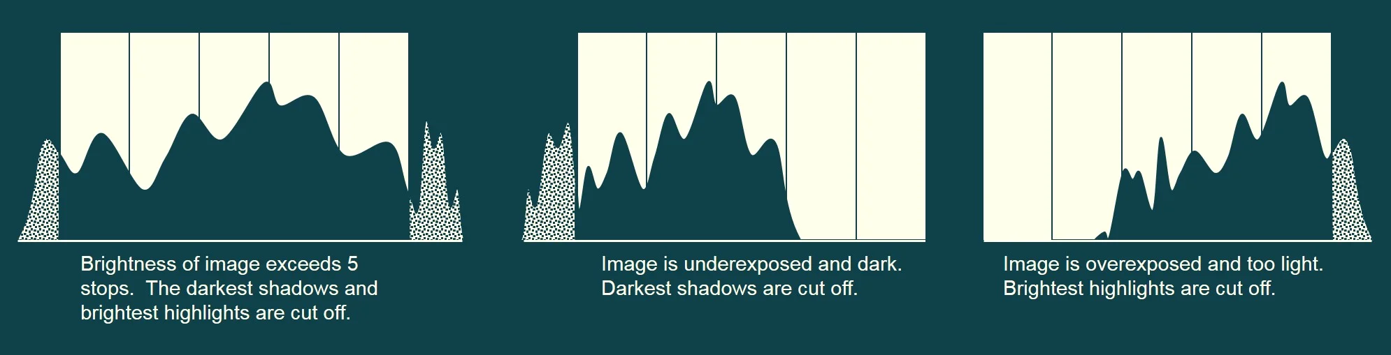 What if the brightness of all pixels were found to exceed 5 stops, or the histogram ran off the left or right end of the scale? These three possibilities are shown below.
