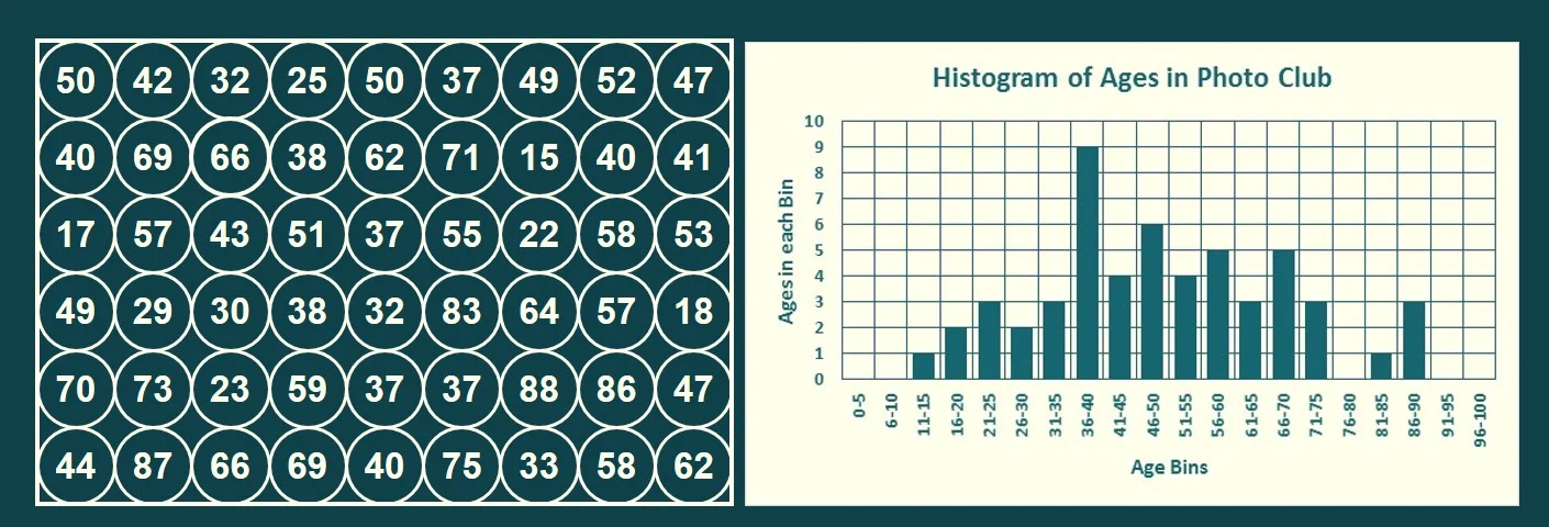 The best way to understand a histogram is to construct one using a simple example. Let’s construct a histogram using the ages of the people in my fictitious photo club. Let’s assume there are 54 people in my club and their ages are shown in the figure below which surprisingly looks like a full frame 36 mm x 24 mm digital sensor having an aspect ratio of 3:2.