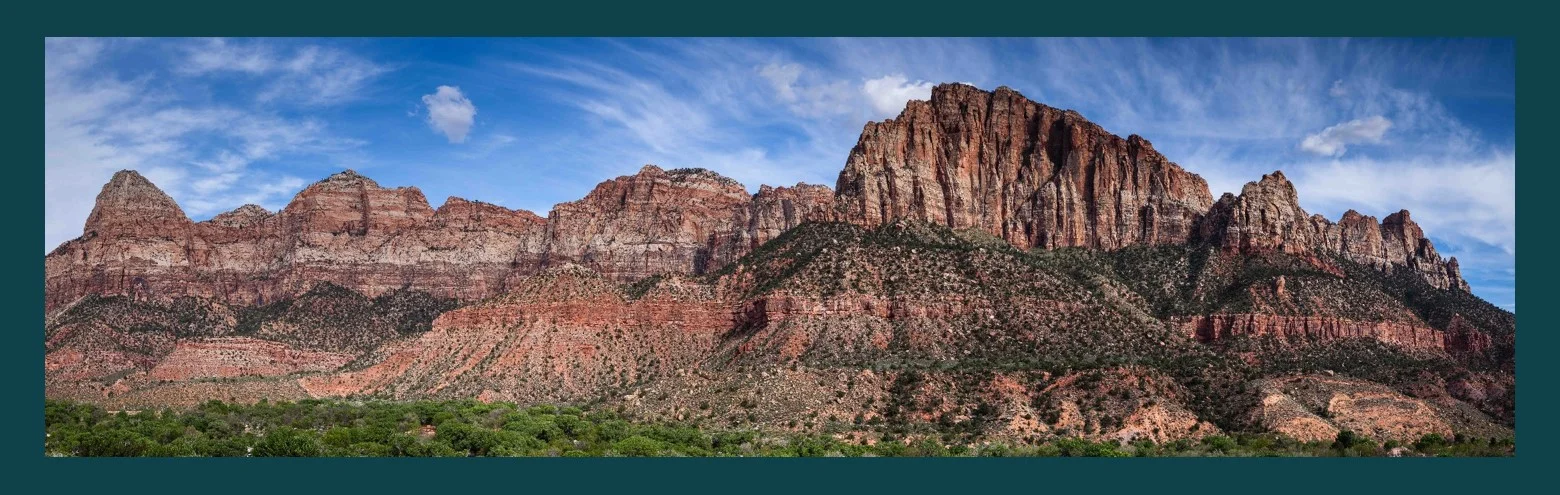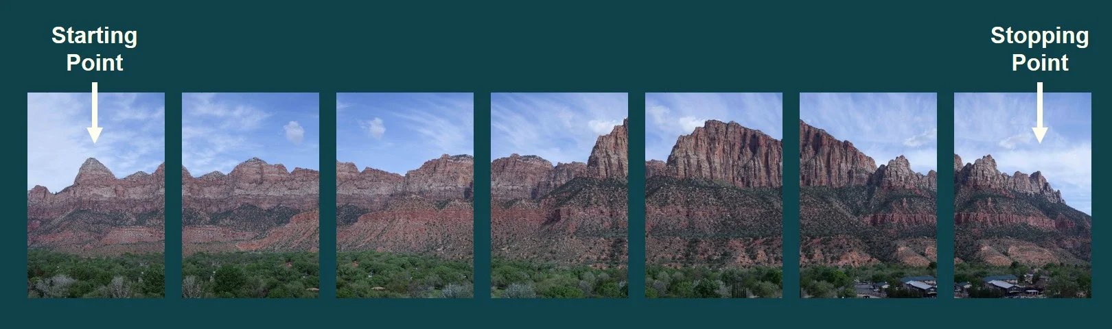I’ve included a panorama example below from Zion National Park. It’s one of my favorites. All seven component photos (RAW format) were captured with a manual exposure setting of ƒ/11 at 1/125 sec with ISO 100. You see that each was taken in portrait orientation with an approximate one-third overlap. I have identified my starting and stopping points on the figure. If I were to guess, I would say the azimuth angle from start to stop was approximately 90 degrees.