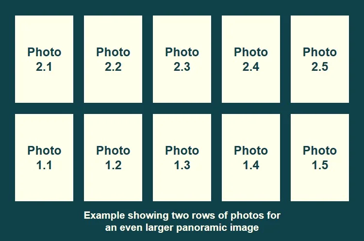 If you are interested in taking your panorama skills to a higher level, you can take multiple rows of photos. See below. The post-processing software, Lightroom, can handle both the vertical and horizontal overlapping edges. Just remember to follow the above steps.